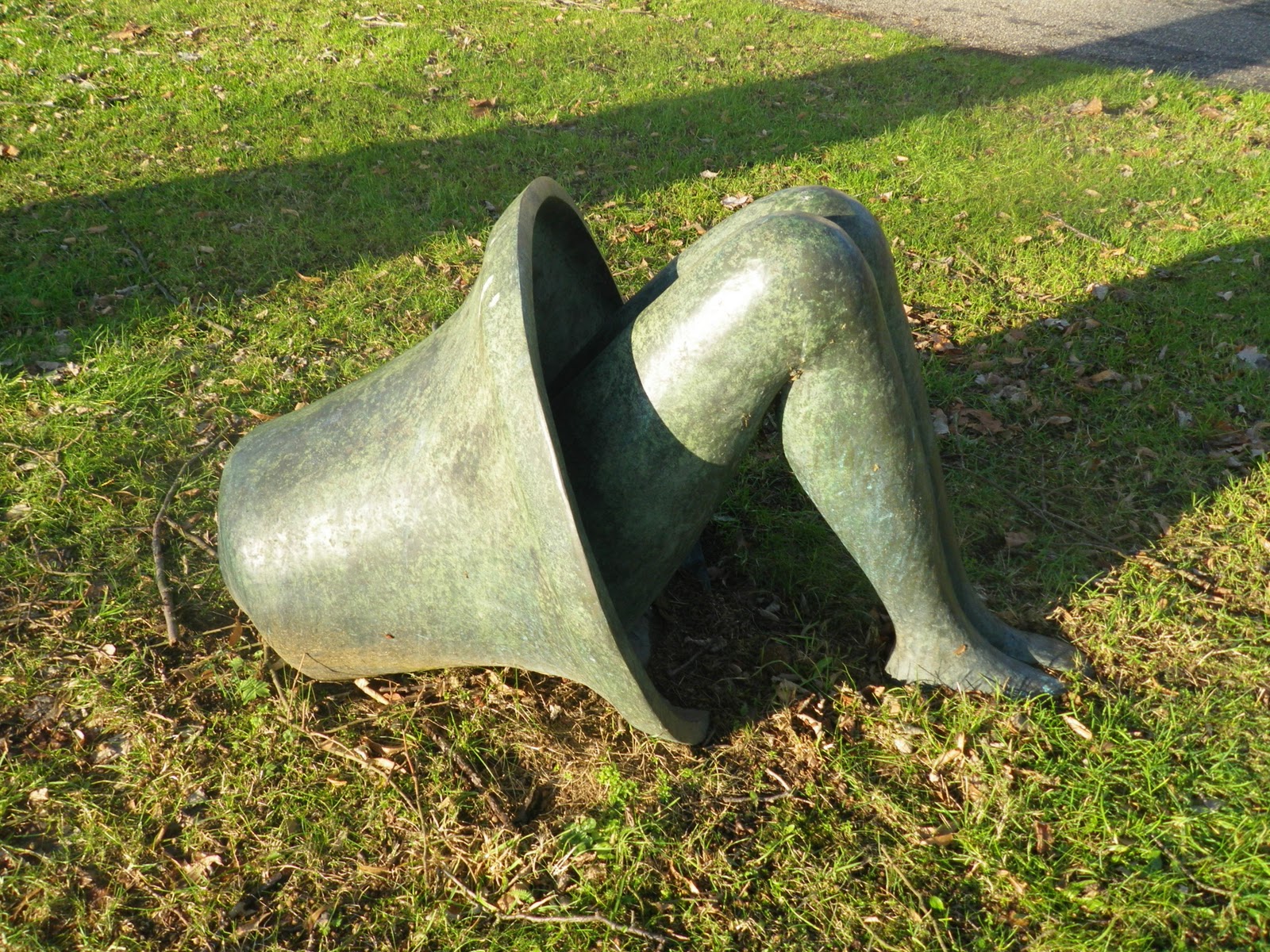 Aan de overkant in de berm zagen we een aantal beelden. Deze beelden bestonden uit benen met "iets" erbij. Heel apart om te zien, maar gelukkig volgde de uitleg een paar meter verderop. Hoewel uitleg, het wandelmannetje werd er niet wijzer van. (Ik ook niet trouwens.) Maar we hebben wel genoten van die "rare" benen.