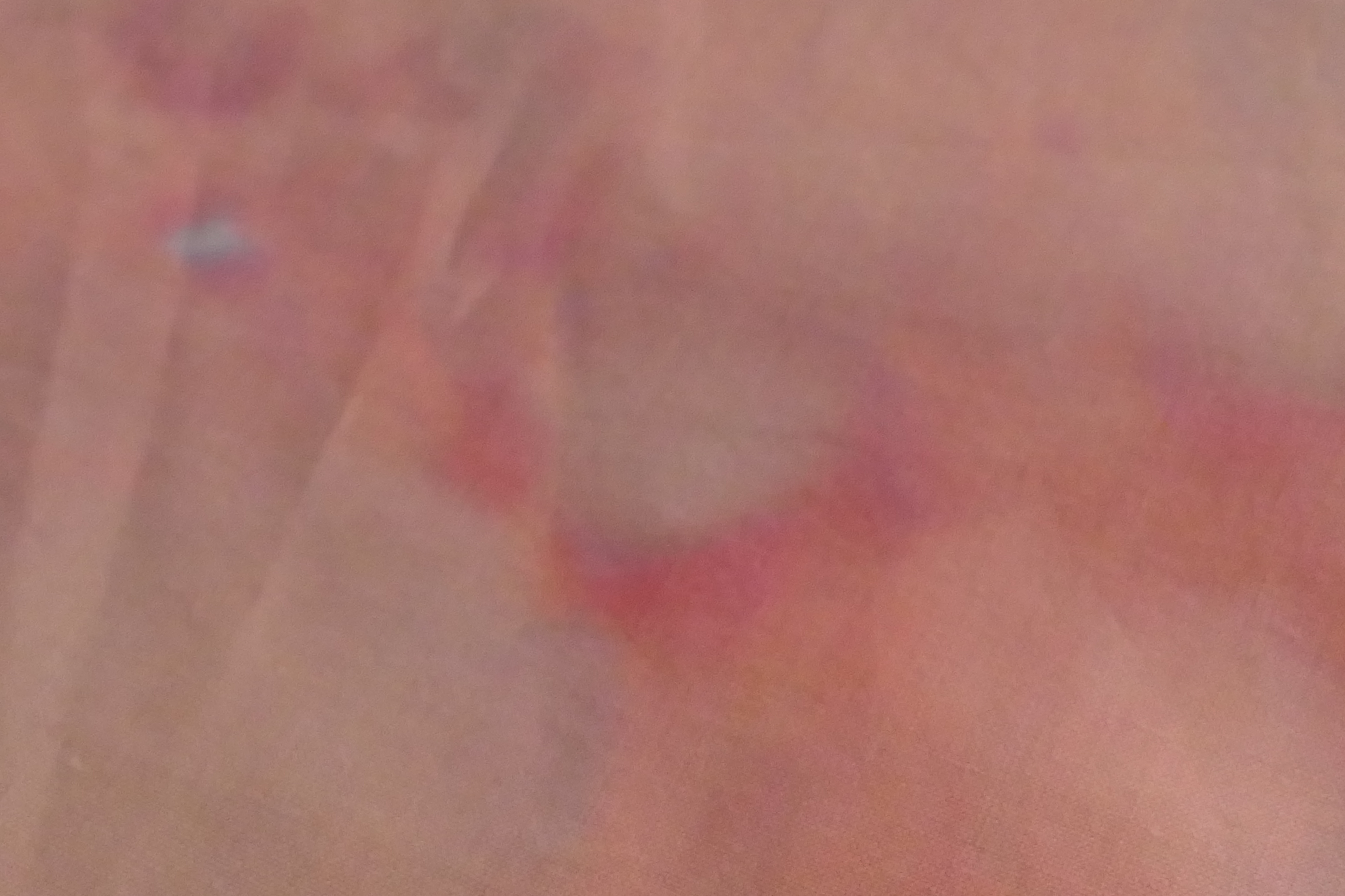 Bij de eerste poging gebruikte ik een complete lap, losjes gedrapeerd in een mand. Na afloop bleken de kleuren erg doorgelopen, zonder echt effect te kunnen zien van de smeltende sneeuw. Mijn conclusie was dat ik waarschijnlijk teveel sneeuw had gebruikt. Hoewel na het strijken er toch wel meer effect in zat dan ik in eerste instantie dacht.